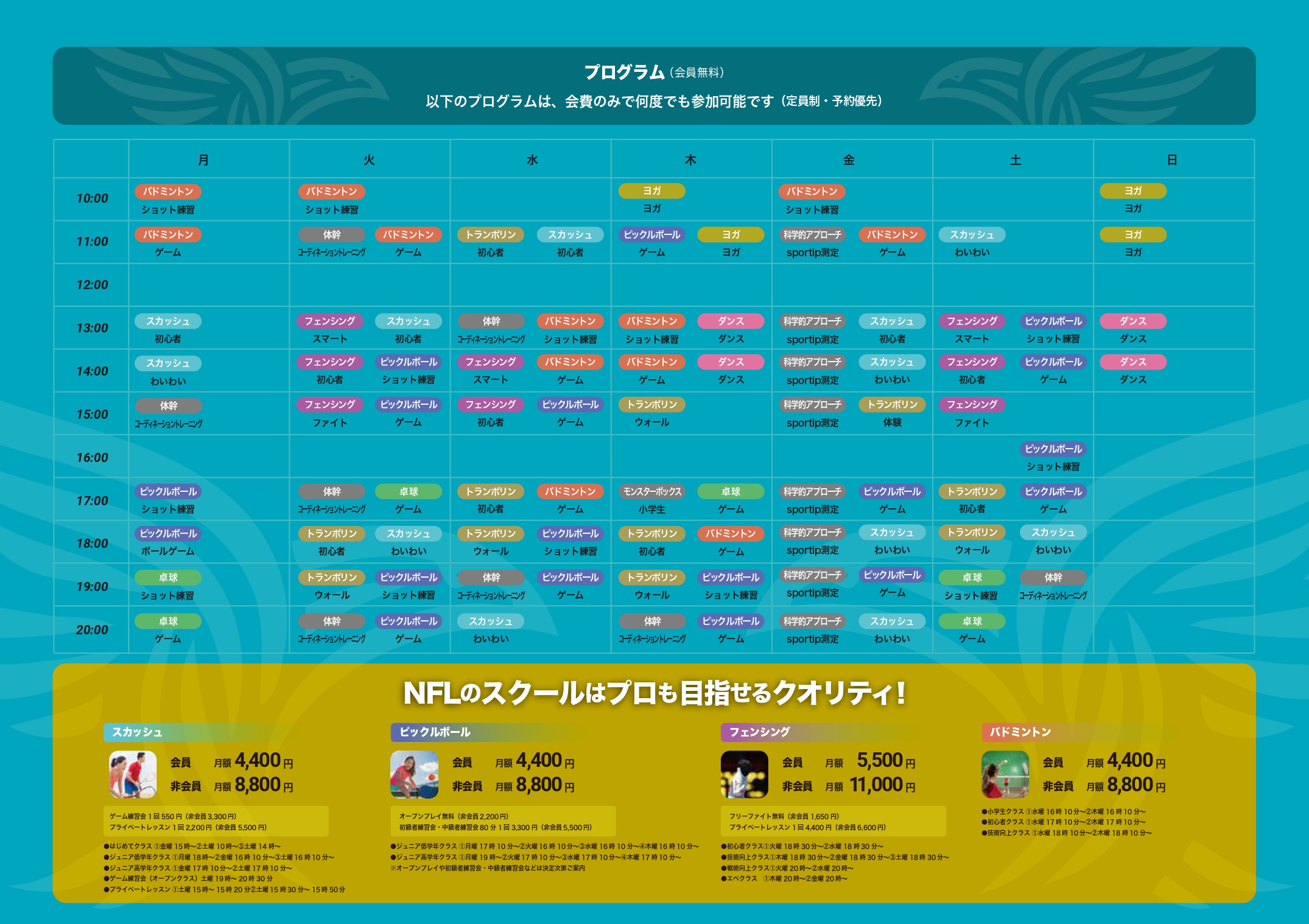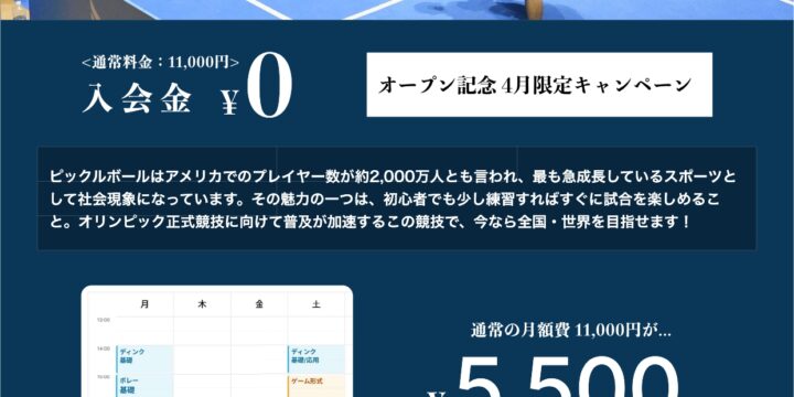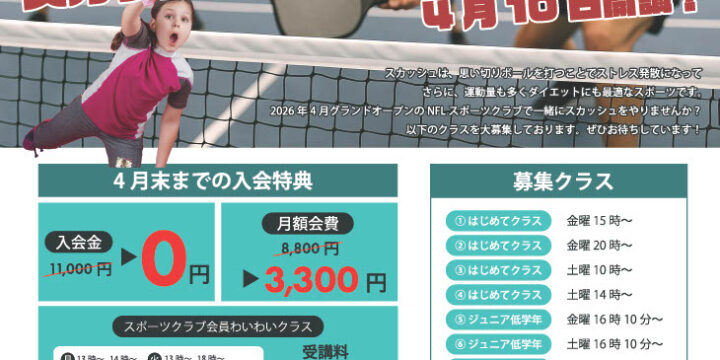 ピックルボールとスカッシュは気軽に1回参加できるオープンプレイ日程を多数開催。